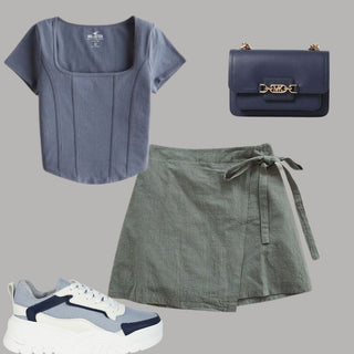 Las faldas cortas y bombachas son tendencia y que mejor que seguir su línea elegante con un top con chaleco en tonos neutros ideales para combinarlos con unos tenis negros.